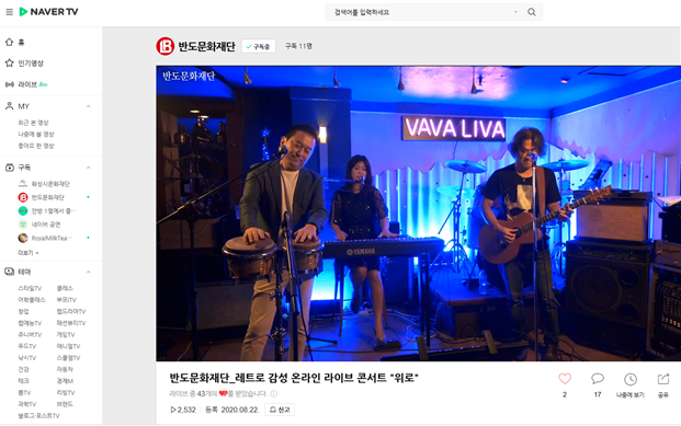 그래도 공연 당일 2,500여 분이 네이버TV와 유튜브 "반도문화재단" 채널을 통해서 관람을 해주셨습니다.